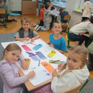 W prace te mocno zaangażowały się uczennice z klasy 5., Wiktoria Hryniewicka, Tatiana Skubis i Ola Domagała. Chociaż zadanie to nie należy do łatwych, wymaga bowiem precyzji i cierpliwości, a także umiejętności manualnych, to dziewczyny radzą sobie bardzo dobrze.