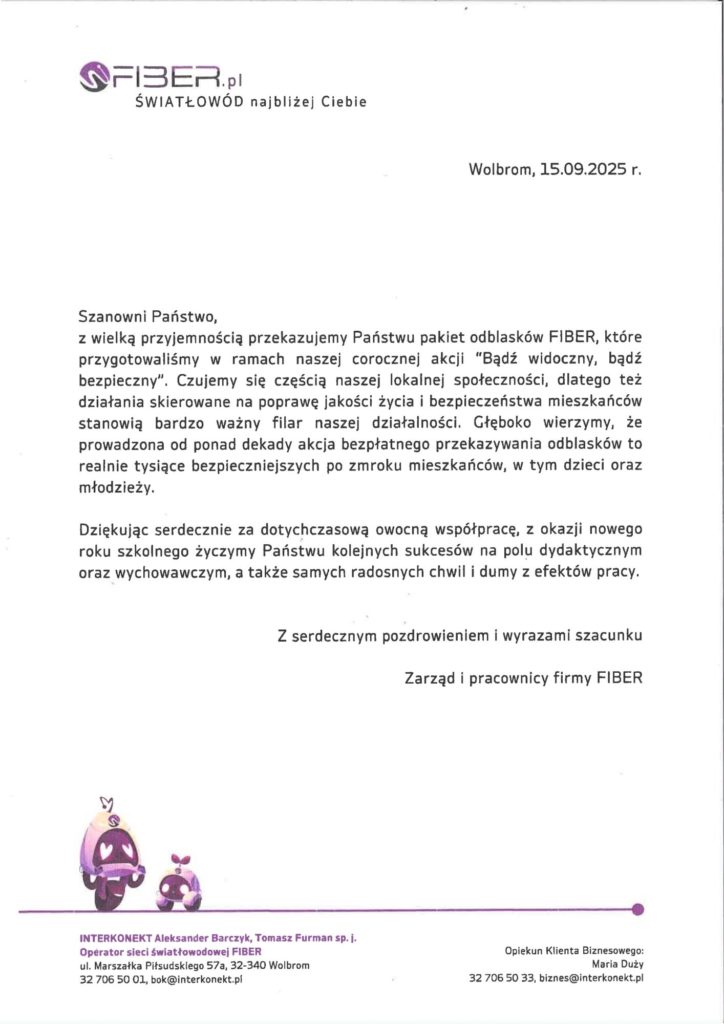 Dziękujemy firmie FIBER INTERKONEKT z Wolbromia za przekazanie wszystkim naszym uczniom i pracownikom odblaskowych opasek. To kolejna edycja akcji firmy “Bądź widoczny, bądź bezpieczny” wspierającej także naszą szkołę. Uczniowie otrzymali praktyczne przedmioty zwiększające ich widoczność po zmroku i podczas poruszania się w pobliżu dróg, a także przypomnieli sobie, jak ważne jest noszenie odblasków, by zadbać o swoje bezpieczeństwo.