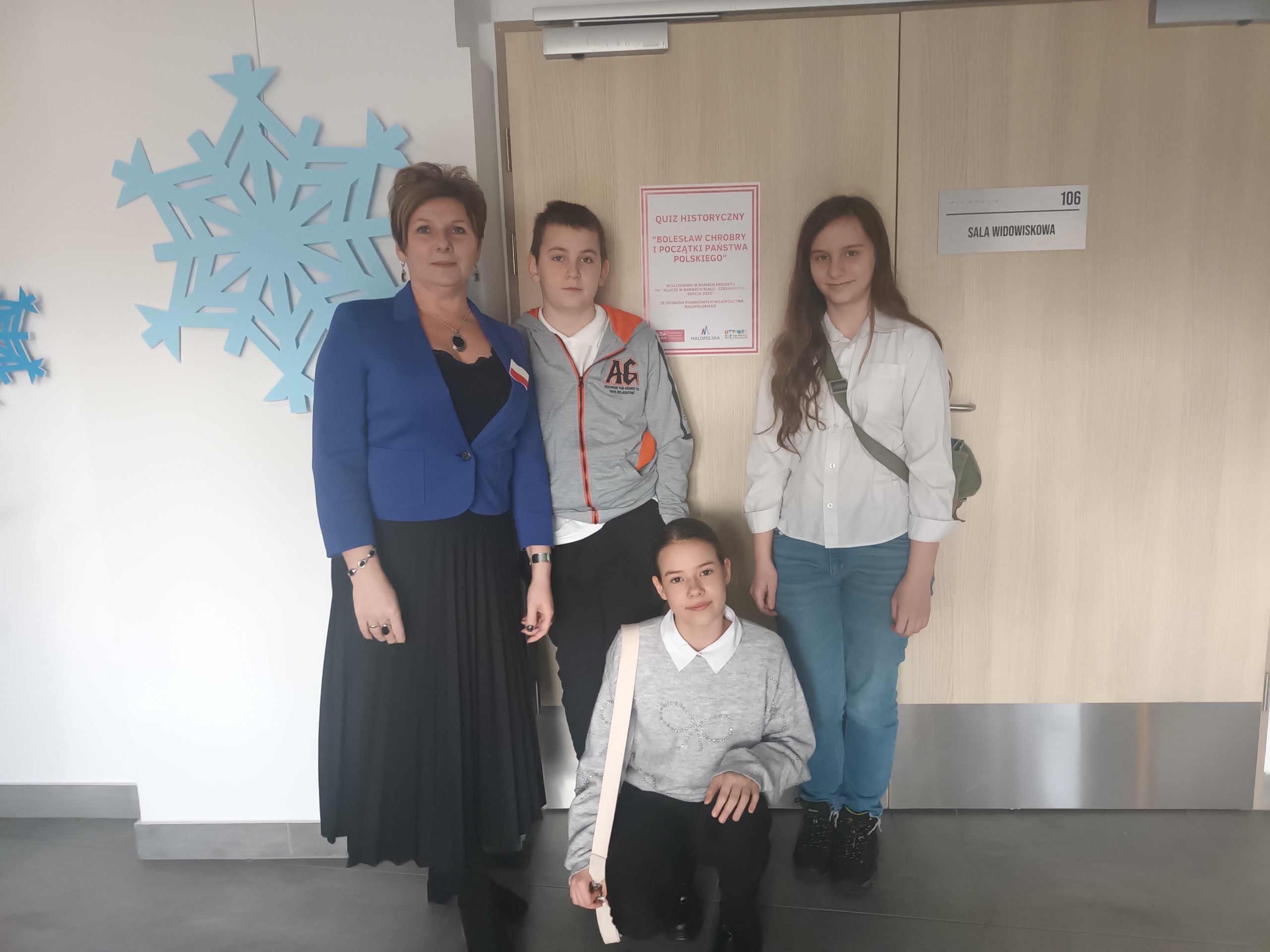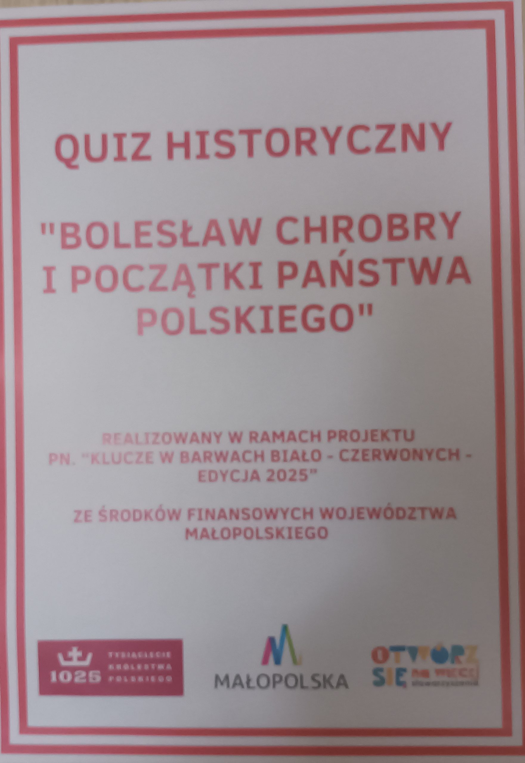 Dziś uczniowie naszej szkoły – Malwina Szota i Antoni Tomsia z klasy 4 oraz Maria Pałka z klasy 5 – wzięli udział w quizie historycznym „Bolesław Chrobry i początki państwa polskiego”, który odbył się w Domu Kultury „Papiernik” w Kluczach.