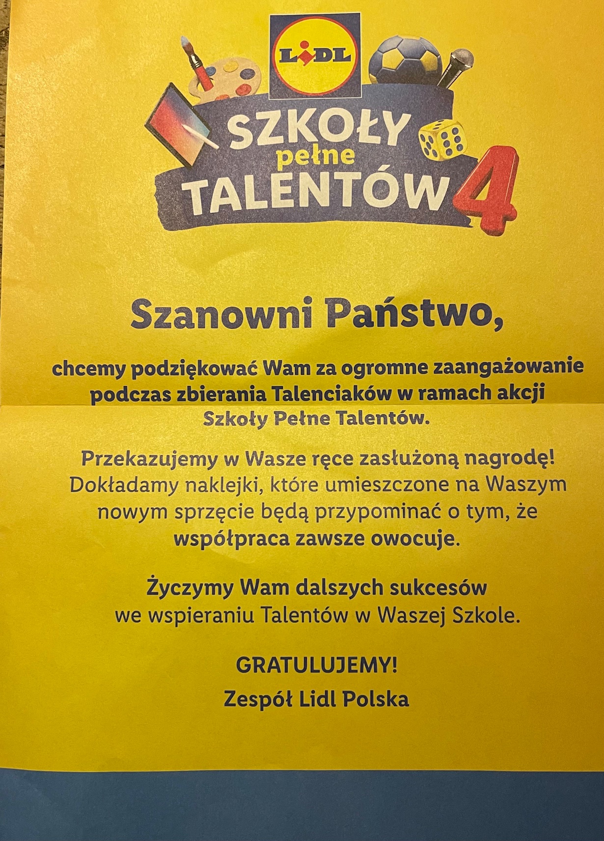 z ogromną radością informujemy, że wspólnymi siłami udało nam się zebrać aż 1352 talenciaki w ramach akcji „Szkoły pełne talentów”! Dzięki Waszemu zaangażowaniu i systematycznemu wsparciu mogliśmy wymienić je na cenne nagrody, które wzbogacą nasze zajęcia i uatrakcyjnią codzienną aktywność uczniów.